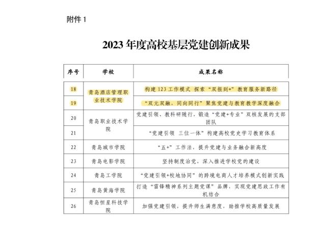 (工商管理学院 刘晓辉)日前,中共青岛市委教育工作委员会印发了《关于公布在青高校基层党建创新成果和培育项目的通知》,经过学校申报、专家评审、集体研究,我院党总支的《构建123工作模式 探索“双报到+”教育服务新路径》获评“2023年度高校基层党建创新成果”。