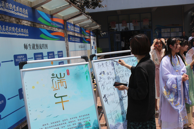6月11日,在学院东餐厅门口,同学们身着传统汉服分发五彩绳,用新时代的精神风貌展示中华传统服装的韵律与大美,引导师生感受传统礼仪风俗和审美品格。师生们频频驻足,观看展板、签名留念、品尝粽子,共同品味源远流长的端午文化。