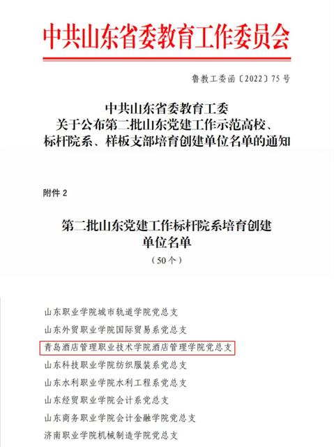 本网讯(酒店管理学院 李心悦)日前,山东省委教育工委公布了第二批山东党建工作示范高校、标杆院系、样板支部培育创建单位名单,我校酒店管理学院党总支入选第二批“山东党建工作标杆院系”。