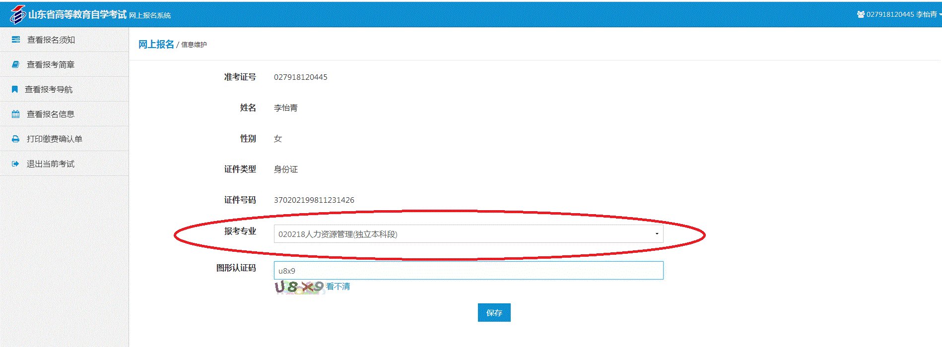 (12)核对信息,确认好报考专业,输入验证码,点击保存。