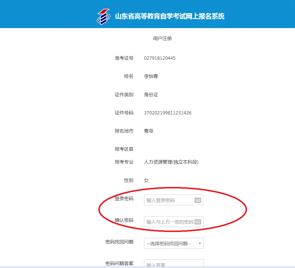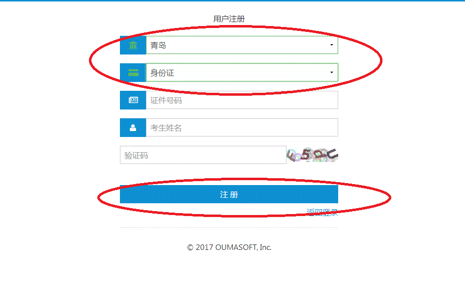 (5)“用户注册”下第一项选择“青岛”,第二项选择“身份证”;“证件号码”输入身份证号,输入正确姓名;点击“注册”。