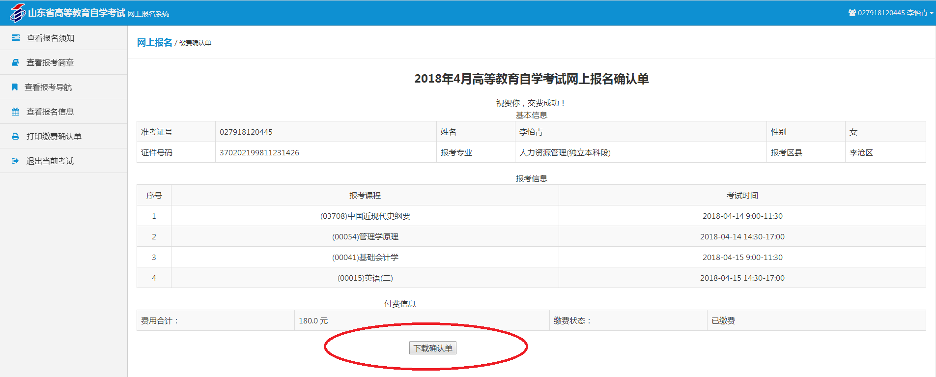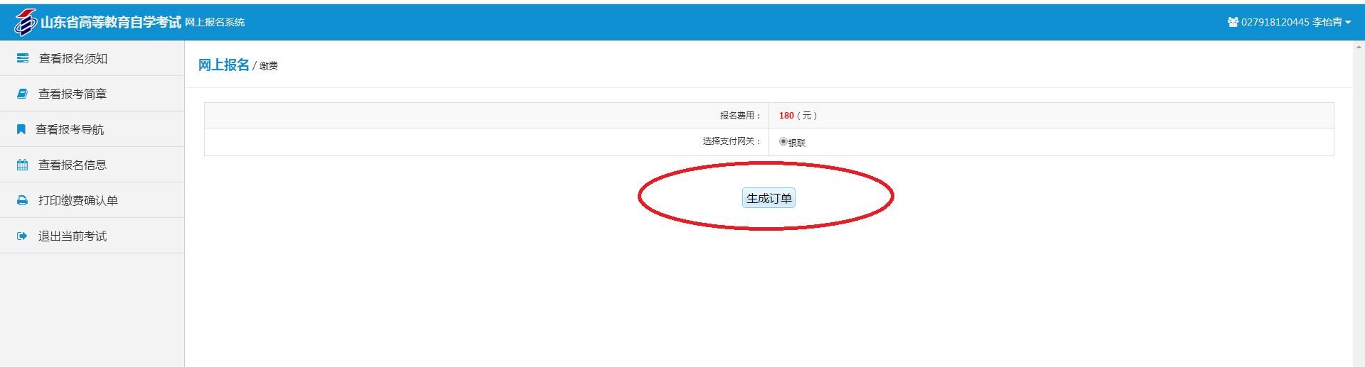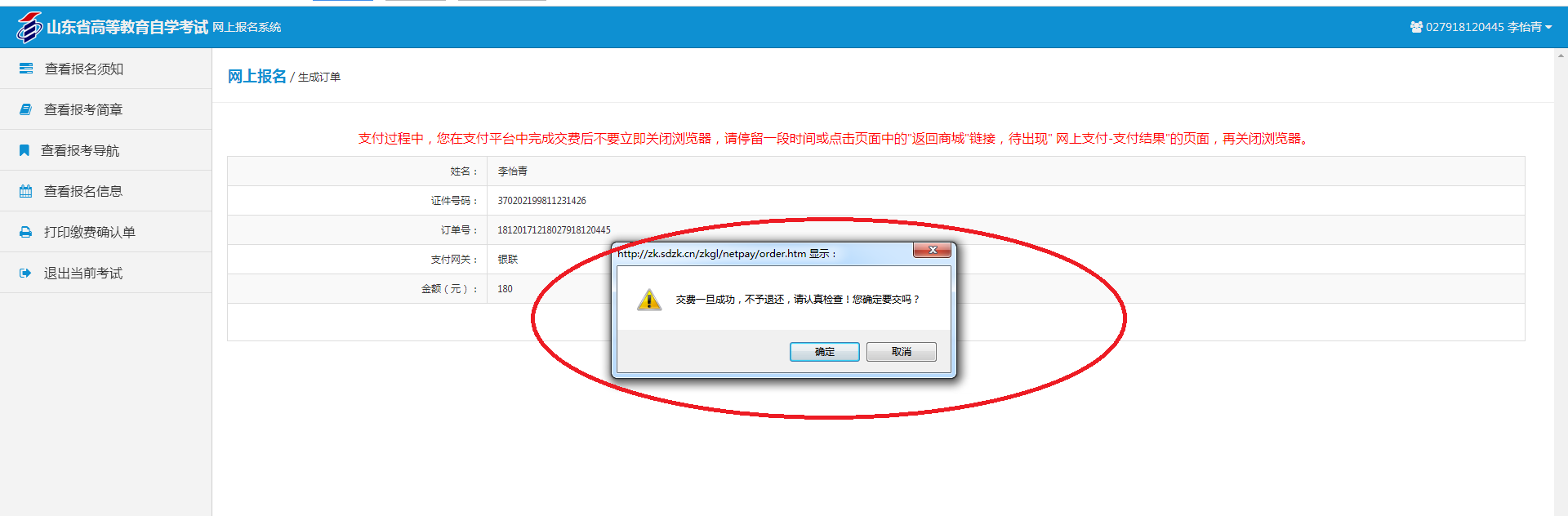 (6)打印订单号:考生网上报名缴费成功后,即完成本次报名,请记录订单号并可根据屏幕内容打印确认单(此确认单仅作为报名成功凭据,并非考试通知单)。