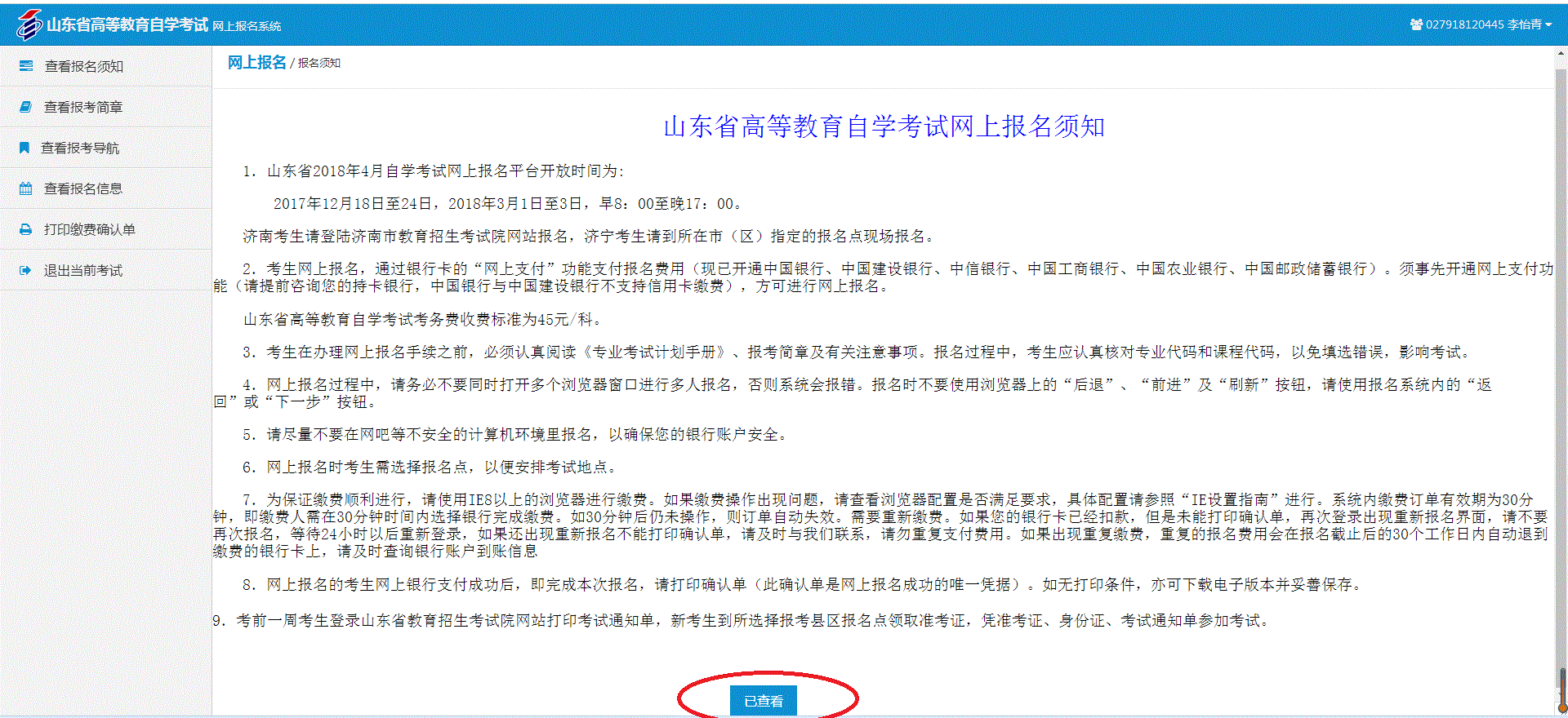(5)注意事项:考生在办理网上报名手续之前,须认真阅读《山东省高等教育自学考试2017年10月考试专业科目一览表》及有关注意事项。为保护考生信息的安全,考生须先输入“山东省高等教育自学考试准考证号”和姓名,经系统校验后方可进入报名环节。报名时务必认真核对专业代码和课程代码,报名成功后的信息将无法删除或修改。