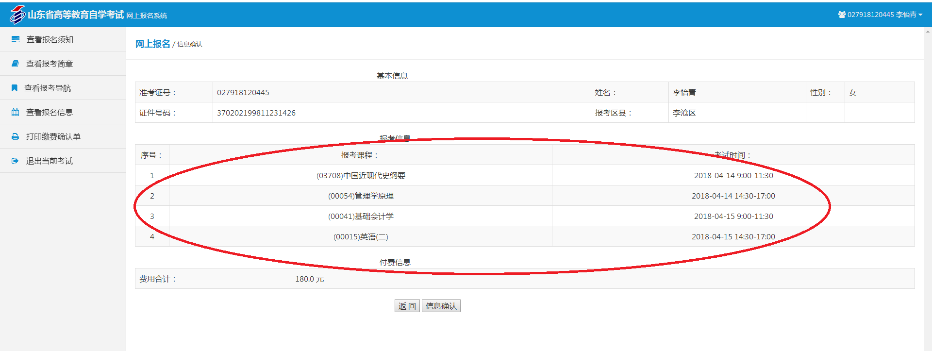 (14)核对报名考试科目,确认无误选择“信息确认”项。