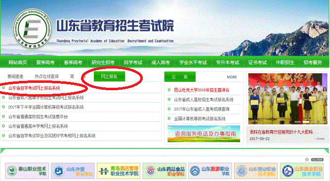 (1)移动鼠标至“网上报名”,点击“山东省自学考试网上报名系统”